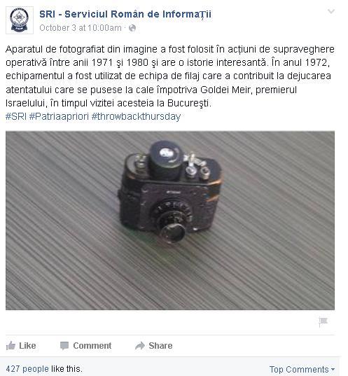 "Aparatul de fotografiat din imagine a fost folosit în acţiuni de supraveghere operativă între anii 1971 şi 1980 şi are o istorie interesantă. În anul 1972, echipamentul a fost utilizat de echipa de filaj care a contribuit la dejucarea atentatului care se pusese la cale împotriva Goldei Meir, premierul Israelului, în timpul vizitei acesteia la Bucureşti", precizează SRI.