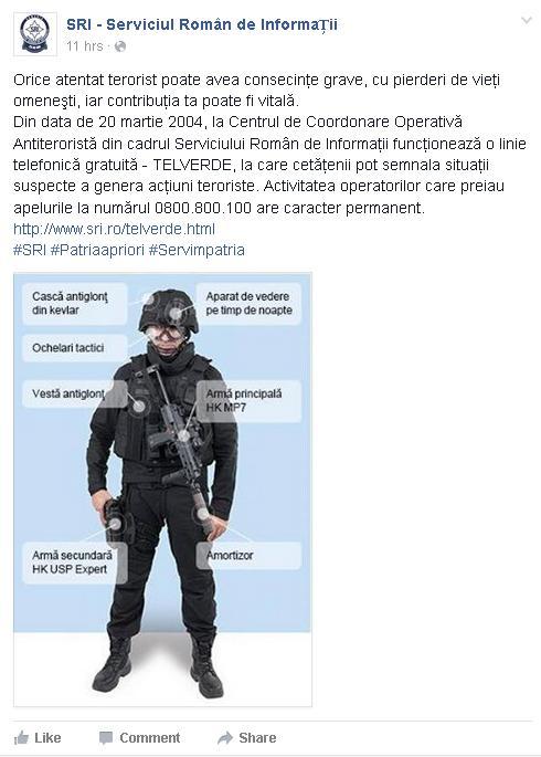 "Orice atentat terorist poate avea consecinţe grave, cu pierderi de vieţi omeneşti, iar contribuţia ta poate fi vitală. Din data de 20 martie 2004, la Centrul de Coordonare Operativă Antiteroristă din cadrul Serviciului Român de Informaţii funcţionează o linie telefonică gratuită - TELVERDE, la care cetăţenii pot semnala situaţii suspecte a genera acţiuni teroriste. Activitatea operatorilor care preiau apelurile la numărul 0800.800.100 are caracter permanent", precizează SRI în postare.
