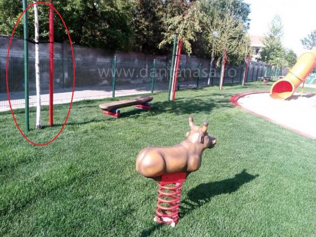 Stâlpi în culorile roșu și verde care susțin arbori cu trunchiul de culoare albă au fost amplasați într-un parc de joacă pentru copii din municipiul Salonta, județul Bihor, potrivit dantanasa.ro.