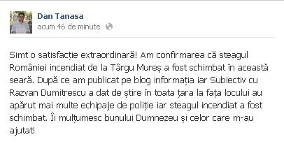 "Simt o satisfacţie extraordinară! Am confirmarea că steagul României incendiat de la Târgu Mureş a fost schimbat în această seară (joi seara - n.r.).