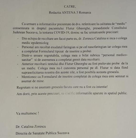După scandalul izbucnit din cauza testării lui Flutur în calitate de medic, DSP Suceava a emis un comunicat pentru Antena 3 în care a explicat că președintele CJ Suceava a fost trecut în acte drept cadru medical dintr-o greșeală.