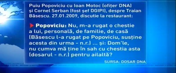 Din spusele celor trei reiese că Băsescu i-ar fi condiţionat un serviciu lui Popoviciu de primire a unor avantaje.