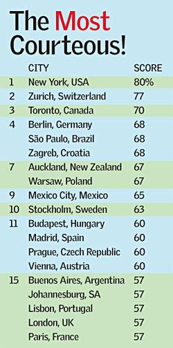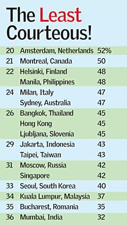 Jurnaliștii de la revista americană Reader’s Digest au realizat un studiu, după ce au mers în 35 de ţări şi au analizat locuitorii lor din prisma a trei criterii: primul a fost dacă vânzătorii le mulţumesc celor care cumpără ceva de la ei din magazin. Rezultatul: cei din Bucureşti au scos cuvântul "mulţumesc" din vorbirea lor.