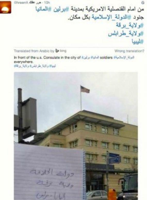 Un susținător al Statului Islamic a publicat o fotografie în care apare un mesaj scris în limba arabă și imaginea Ambasadei SUA din Berlin.