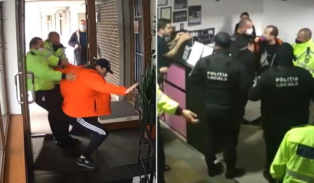 După mai multe îmbrânceli cu cei doi agenţi, bărbatul ajunge în interior, iar angajaţii salii de sport reuşesc să aplaneze conflictul şi să îi scoată afară pe politişti.