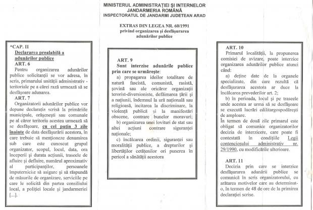 Iată mai jos (si in Galeria FOTO) pliantul prin care arădenilor li se comunicau condițiile în care au voie să își manifeste dreptul la liberă exprimare, în condițiile în care ei nu erau organizați.