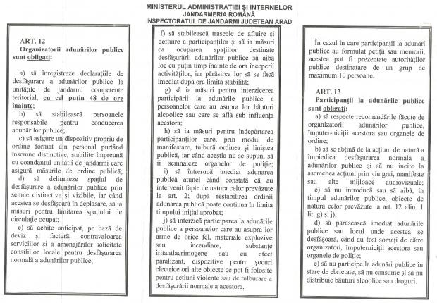 Cristina M. ne-a scris că, în timp ce manifestanții erau încă în fața Primăriei, jandarmii din Arad (o doamna s-a recomandat fiind căpitan de Jandarmerie) le-au împărțit niște pliante. Cristina M. este de părere că acestea aveau menirea de ai intimida pe cetățenii aflați acolo.