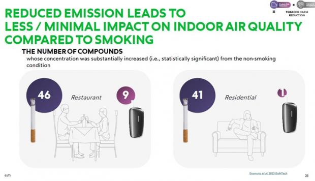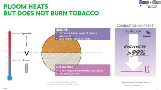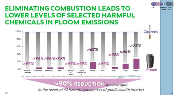 Teste științifice suplimentare arată că există o reducere medie a nivelurilor a 43 de substanțe nocive în vaporii Ploom, comparativ cu fumul de țigară convențional. Testele toxicologice și clinice indică faptul că această expunere redusă la substanțe nocive stă la baza potențialului de risc redus al produsului Ploom.