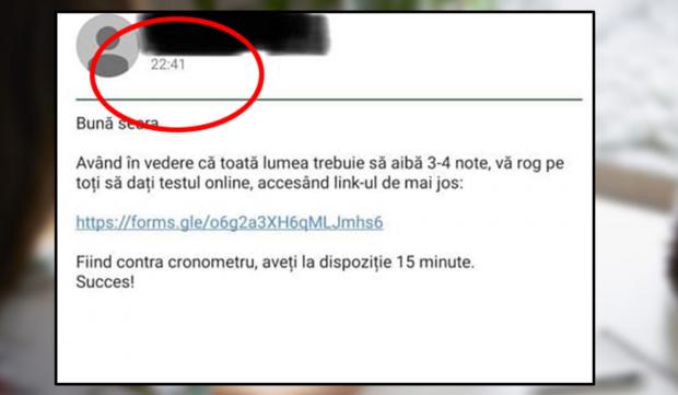 "Având în vedere că toată lumea trebuie să aibă 3-4 note, vă rog pe toţi să daţi testul online, accesând linkul de mai jos. Fiind contra cronometru, aveţi la dispoziţie 15 minute. Succes!" - este mesajul care i-a lăsat cu gura căscată pe elevi.