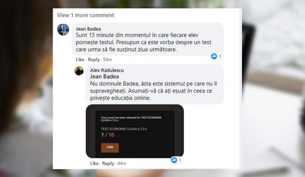 Jean Badea, subsecretar în Ministerul Educaţiei, a reacţionat pe Facebook: "Sunt 15 minute din momentul în care fiecare elev pornește testul. Presupun ca este vorba despre un test care urma să fie susținut ziua următoare", a fost comentariul lui Badea lăsat pe Facebook.