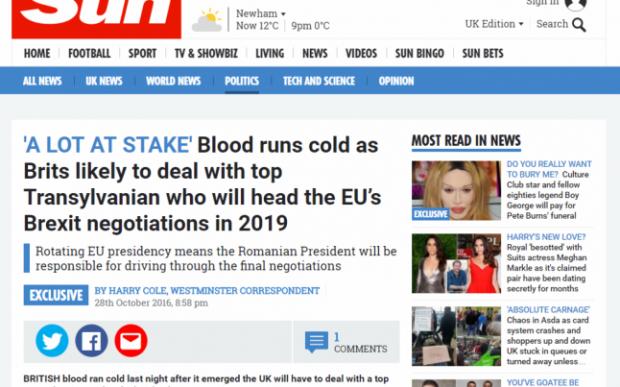Tabloidul britanic „The Sun” a publicat un material ironic la adresa faptului că România ar putea prelua preşedinţia rotativă a Consiliului Uniunii Europene în primele luni din 2019. Conform declaraţiilor premierului britanic Theresa May, asta ar însemna că preşedinţia României s-ar putea suprapune cu ultima fază a negocierilor pentru ieşirea Marii Britanii din Uniunea Europeană.
