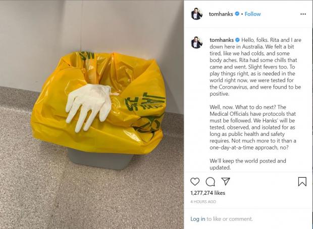 Aflat în Australia împreună cu soția sa, actrița Rita Wilson, Tom Hanks și-a anunțat fanii, printr-o rețea socială, că au fost testați pentru coronavirus, testele fiind pozitive.