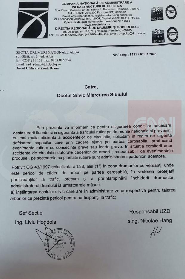 Antena 3 CNN a obținut în exclusivitate documentul care arată clar faptul că încă de pe data de 7 martie responsabilii direcției de Drumuri Județene Alba au trimis această solicitare către cei de la Ocolul Miercurea Sibiului prin care îi anunță asupra faptului că există pericol de accidente rutiere din cauza arborilor care stau să se prăbușească peste carosabil.