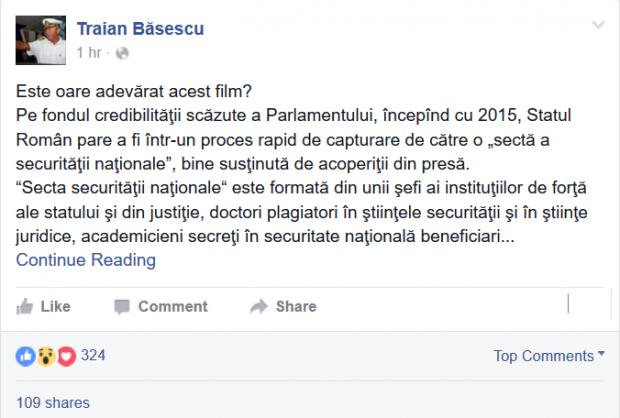 Traian Băsescu a revenit pe Facebook cu o postare amplă despre serviciile secrete și statul confiscat de acestea. Fostul preşedinte susține că există în desfășurare un asalt asupra Parlamentului.