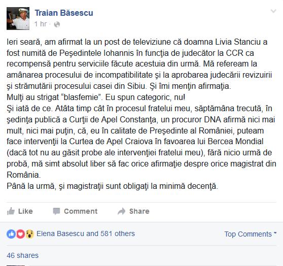 Traian Băsescu a comentat, luni, pe Facebook decizia președintelui Klaus Iohannis de a o numi pe Livia Stanciu judecător la Curtea Constituțională a României.