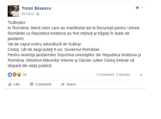 Pentru violenţa jandarmilor împotriva unioniştilor din Republica Moldova şi România, Ministrul Afacerilor Interne şi Dacian Julien Cioloş trebuie să dispară din viaţa publică'', a scris Traian Băsescu.