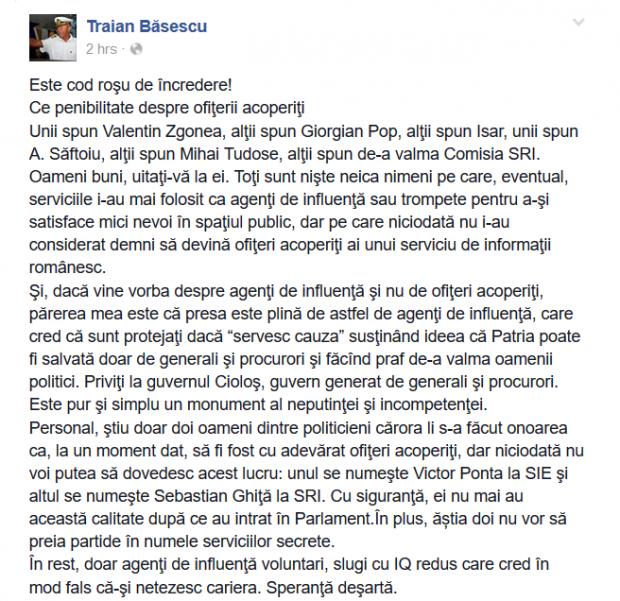 Traian Băsescu a reacționat, într-o postare pe Facebook, la acuzațiile lui Victor Ponta la adresa soțului Alinei Gorghiu, Lucian Isar, pe care l-a numit ”ofițer acoperit”.