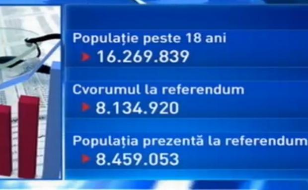 Numărul persoanelor de peste 18 ani din România este de 16.269.839, ceea ce înseamnă că cvorumul la referendum trebuia să fie de 8. 134.920.
