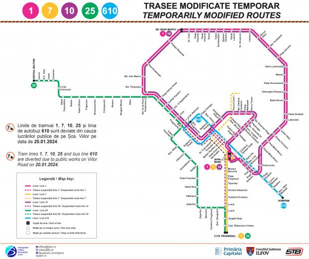 Liniile de tramvai 1, 7, 10 și 25 și linia navetă de autobuz 610 vor funcționa pe trasee modificate în ziua de sâmbătă.