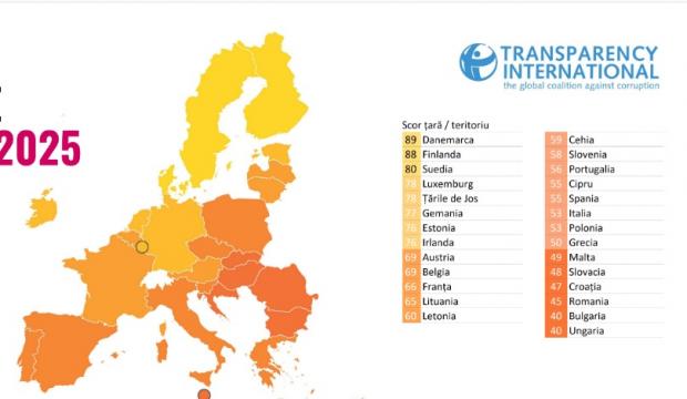Indicele de Percepție a Corupției (IPC) în 2025, publicat de Transparency International, arată că România rămâne una dintre cele mai corupte ţări din Uniunea Europeană. Doar Bulgaria şi Ungaria stau mai prost decât noi la acest capitol. Cu 45 de puncte din 100 posibile în IPC 2025, România înregistrează de asemenea o stagnare, diferența față de 2012 fiind de doar un punct în plus. Cu un scor care a variat de la un an la altul cu 1 – 2 puncte, România rămâne printre ultimele trei state din UE în clasamentul IPC, alături de Bulgaria (40) și Ungaria (40).