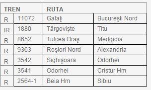 S-a luat decizia anulării trenurilor de mai jos, pentru adaptarea circulaţiei feroviare la posibilităţile efective, iar traficul de pasageri va fi preluat, în măsura posibilităţilor, de celelalte trenuri rămase în grafice, arată un comunicat al CFR Călători.