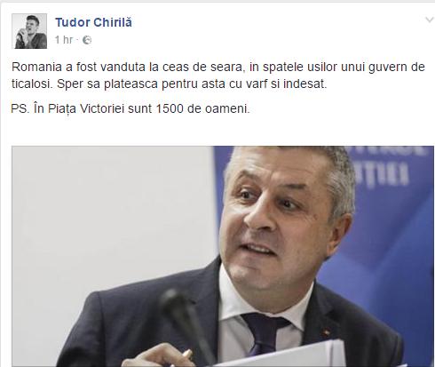 ''România a fost vândută la ceas de seară, în spatele uşilor unui guvern de ticăloşi. Sper să platească pentru asta cu vârf şi îndesat'', a scris Tudor Chirilă.