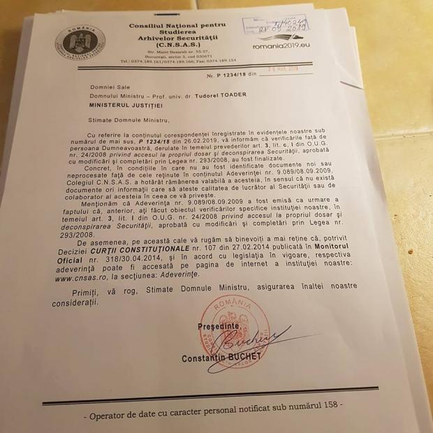 „Înţelegând faptul că se solicită verificarea mea de către CNSAS, postez recenta comunicare, în urma ultimei verificări, probabil cea de a patra!”, a scris Toader, alături de o fotografie cu documentul în cauză.