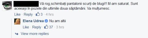 Elena Udrea se folosește de Facebook pentru a promova fiecare eveniment la care participă. Dar, în cel mai recent colaj de imagini, un utilizator de Facebook îi atrage atenția că ar trebui să își schimbe pantalonii, pentru că apare în foarte multe poze doar cu ei.