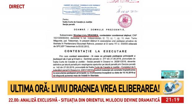 "Subsemnatul Nicolae-Liviu Dragnea, contestator condamnat deținut, CNP..., domiciliat în bd.... mun. Turnu Măgurele, jud. Teleorman, în prezent deținut în executarea unei pedepse privative de libertate în Penitenciarul București Rahova, posesor al CI seria... CONTESTAȚIE LA EXECUTARE prin care contest executarea - în ceea ce privește pedeapsa principală a închisorii de 3 ani și 6 luni a - Sentinței penale nr. 377 din 21.06.2018, pronunțată de Înalta Curte de Casație și Justiție - Secția Penală în Dosarul nr. 2628/ 2016, devenite definitive pe latură penală prin respingerea apelurilor pe latură penală prin Decizia penală nr. 142 din 27.05.2019, pronunțată de Înalta Curte de Casație și Justiție - Completul de 5 judecători penal în Dosarul 2401/1/2018 și solicit instanței să constate împiedicarea la executarea pedepsei principale cu închisoarea începând cu data de 10.10.2019 și să dispună punerea mea de îndată în libertate". (sursa Lumea Justiției)
