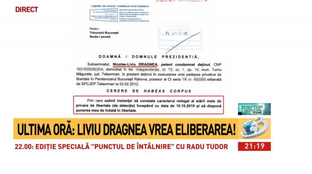 "Subsemnatul Nicolae-Liviu Dragnea, petent, condamnat deținut, CNP..., domiciliat în bd.... mun. Turnu Măgurele, jud. Teleorman, în prezent deținut în executarea unei pedepse privative de libertate în Penitenciarul București Rahova, posesor al CI seria... CERERE DE HABEAS CORPUS prin care solicit instanței să constate caracterul nelegal al stării mele de privare de libertate (de detenție) începând cu data de 10.10.2019 și să dispună punerea mea de îndată în libertate." (sursa Lumea Justiției)