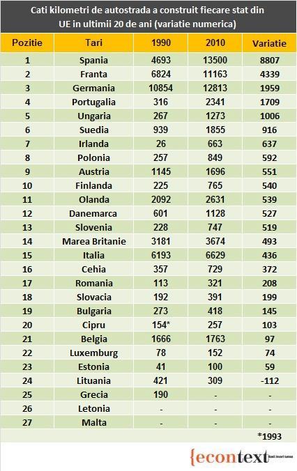 Fruntaşi sunt spaniolii, care au construit 8800 de kilometri de drumuri şi autostrăzi, iar mai rău decât noi stau Lituanienii, care au înregistrat chiar performanţa unei involuţii: în 1990 aveau 421 de kilometri, iar în 2010 aveau 309.