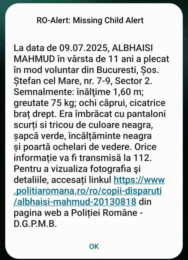 Pentru găsirea copilului, autoritățile au transmis un mesaj RO-Alert de „alertă copil dispărut”: