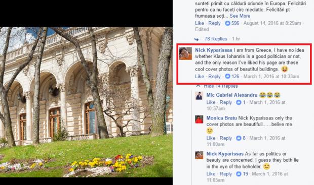 ''Sunt din Grecia. Habar n-am dacă Klaus Iohannis este un politician bun sau nu și singurul motiv pentru care am dat like paginii sunt aceste fotografii superbe ale acestor clădiri'', a scris tânărul.