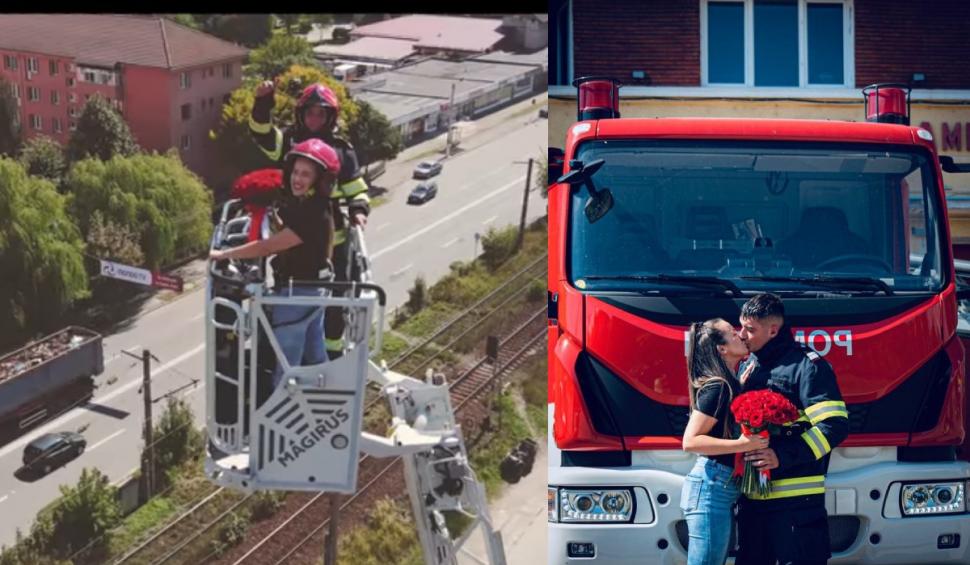 "Sergentul major Andrei Calimandruc a îngenuncheat şi a oferit inelul alesei inimii sale în nacela autoscării de intervenţie, din cadrul Detaşamentului Petroşani, ridicată la 35 de metri înălţime.