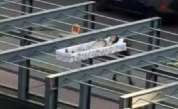 Controversata operă de artă care întruchipează imaginea artistului, într-un sicriu, a speriat oamenii care au alertat autoritățile. Lucrarea va sta expusă în parcarea respectivă până la 1 noiembrie.