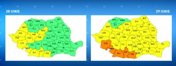 Totodată, în judeţele Caraş-Severin, Mehedinţi, Dolj, Olt şi Teleorman va fi cod portocaliu de disconfort termic, pe tot parcursul zilei de joi. Astfel, în acest zone se vor atinge local maxime termice de 37 - 39 de grade şi pe arii restrânse de 40 de grade, iar disconfortul termic va fi deosebit de accentuat.