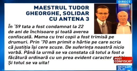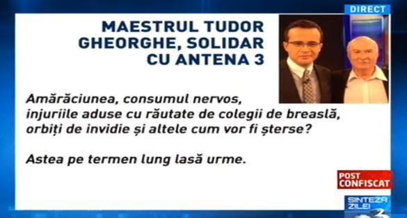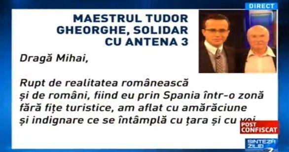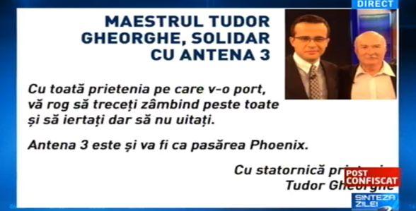 Tudor Gheorghe a redactat un mesaj de susţinere a postului Antena 3. Mihai Gâdea a citit în ediţia de miercuri seară a emisiunii Sinteza Zilei mesajul impresionant trimis de celebrul artist.