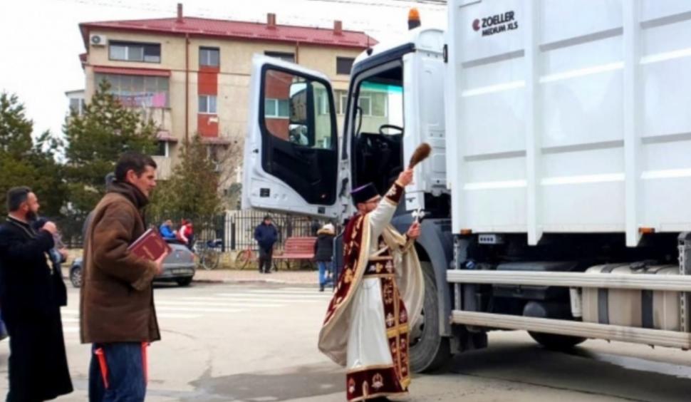 Mașina de gunoi a fost sfințită la sfârșitul anului trecut de preotul din zonă. Evenimentul a fost atunci anunțat cu fast de autorități.
