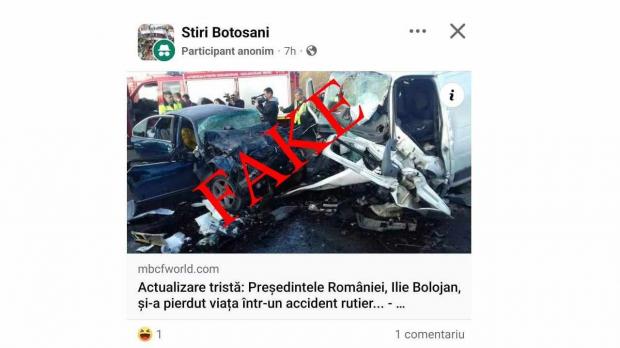 Ministerul Afacerilor Interne și Inspectoratul pentru Situaţii de Urgenţă Botoşani au anunțat sâmbătă că, în ultimele ore, în mediul online au fost postate mai multe ştiri false despre producerea unor accidente rutiere grave sau incendii devastatoare în care ar fi implicate, inclusiv, persoane publice, precum președintele interimar Ilie Bolojan. Într-un fake news se anunța că „președintele și-a pierdut viața într-un accident rutier”.