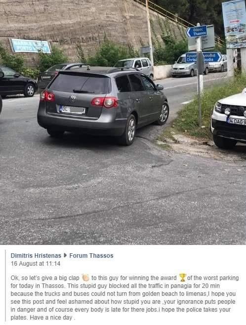 "Să-l felicităm pe acest tip care câștigă premiul pentru cea mai proastă parcare în Thassos. Acest prostănac a blocat tot traficul timp de 20 de minute deoarece camioanele și autobuzele nu au putut să circule de la Golden Beach la Limenas.