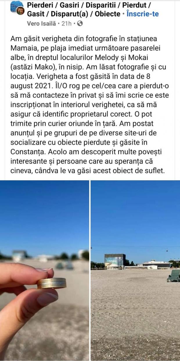 Am postat anunțul și pe grupuri de pe diverse site-uri de socializare cu obiecte pierdute și găsite în Constanța. Acolo am descoperit multe povești interesante și persoane care au speranța că cineva, cândva le va găsi acest obiect de suflet”, a scris tânăra într-o postare pe un grup de Facebook.