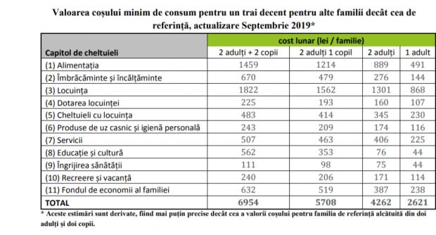 Valoarea coşului minim de consum pentru un trai decent pentru o familie de doi adulţi şi doi copii, calculat pentru luna Septembrie 2019 este de 6954 lei pe lună. Valoarea coşului pentru o familie de doi adulţi şi un copil este de 5708 lei pe lună, pentru o familie de doi adulţi fără copii este de 4262 lei pe lună, iar pentru o persoană adultă singură este de 2621 lei pe lună.