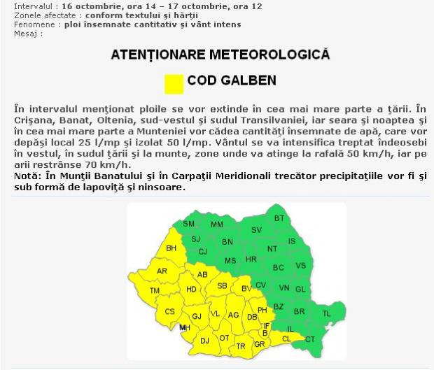 "Ploile se vor extinde în cea mai mare parte a ţării. În Crişana, Banat, Oltenia, sud-vestul şi sudul Transilvaniei, iar seara şi noaptea şi în cea mai mare parte a Munteniei vor cădea cantităţi însemnate de apă, care vor depăşi local 25 l/mp şi izolat 50 l/mp.