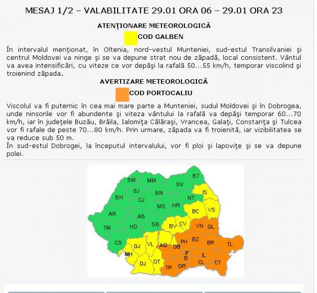 Viscolul va fi puternic în cea mai mare parte a Munteniei, sudul Moldovei şi în Dobrogea, unde ninsorile vor fi abundente şi viteza vântului la rafală va depăşi temporar 60...70 km/h, iar în judeţele Buzău, Brăila, Ialomiţa Călăraşi, Vrancea, Galaţi, Constanţa şi Tulcea vor fi rafale de peste 70...80 km/h. Prin urmare, zăpada va fi troienită, iar vizibilitatea se va reduce sub 50 m.