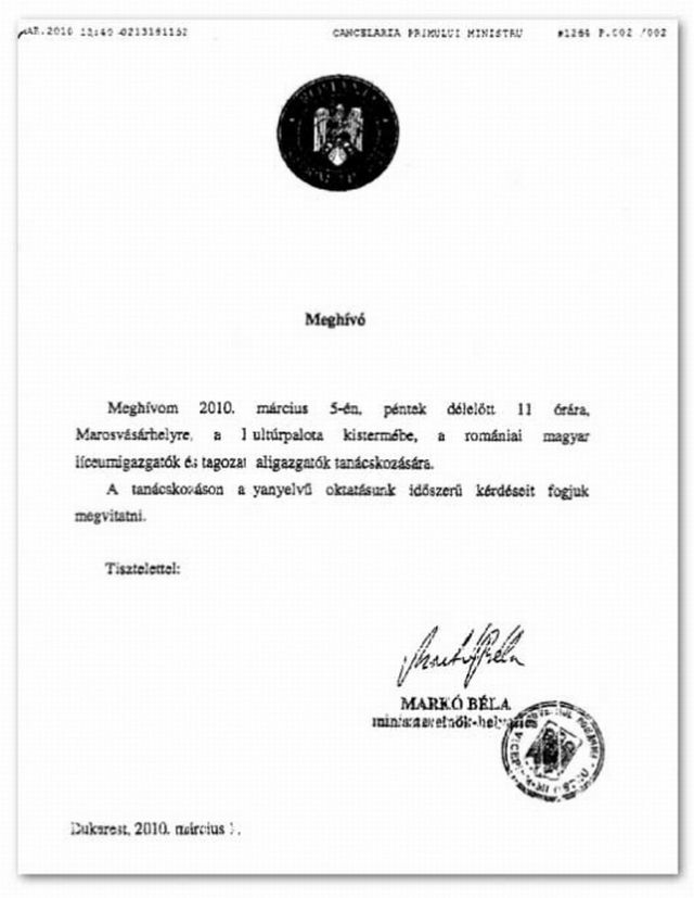 Un document redactat exclusiv în limba maghiară, cu antetul Guvernului şi cu ştampila vicepremierului, a fost trimis directorilor maghiari de licee, pentru o reuniune pe tema învăţământului, notează Jurnalul Naţional.