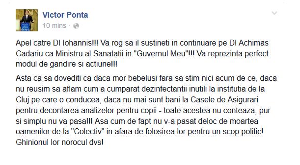 ''Apel catre Dl Iohannis!!! Va rog sa il sustineti in continuare pe Dl Achimas Cadariu ca Ministru al Sanatatii in "Guvernul Meu"!!! Va reprezinta perfect modul de gandire si actiune!!!