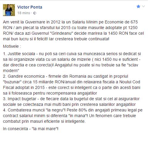 ''Am venit la Guvernare in 2012 la un Salariu Minim pe Economie de 675 RON / am plecat la sfarsitul lui 2015 cu toate masurile adoptate pt 1250 RON/ daca azi Guvernul "Grindeanu" decide marirea la 1450 RON face cel mai bun lucru si il felicit! Iar cresterea trebuie continuata!