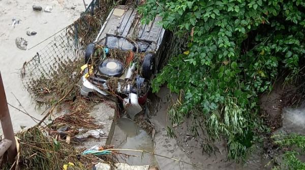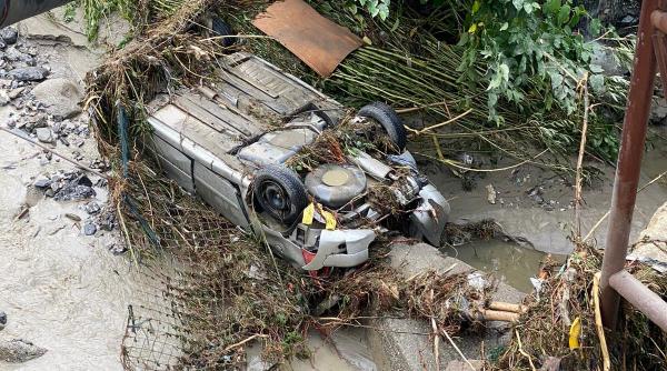 Mașină luată de viitură în Sinaia. Zeci de gospodării au fost inundate