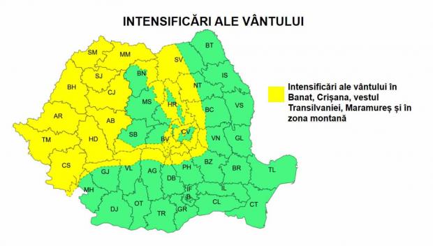 „Vântul va avea temporar intensificări, la început în Banat și Crișana, iar spre seară și noaptea și în vestul Transilvaniei și Maramureș, cu viteze de 50...60 km/h și izolat de 70 km/h. În zonele montane vor fi intensificări ale vântului cu viteze de 70...90 km/h, iar la altitudini de peste 1700 m vor fi rafale de 90...120 km/h”, se arată în comunicatul ANM.