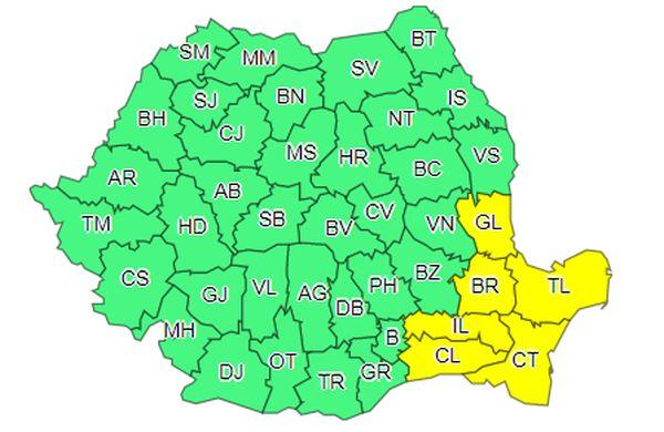 ANM precizează că, în judeţele Galaţi, Brăila, Ialomiţa, Călăraşi, Tulcea şi Constanţa, se vor cumula cantităţi de apă ce vor depăşi local 30 - 40 l/mp.